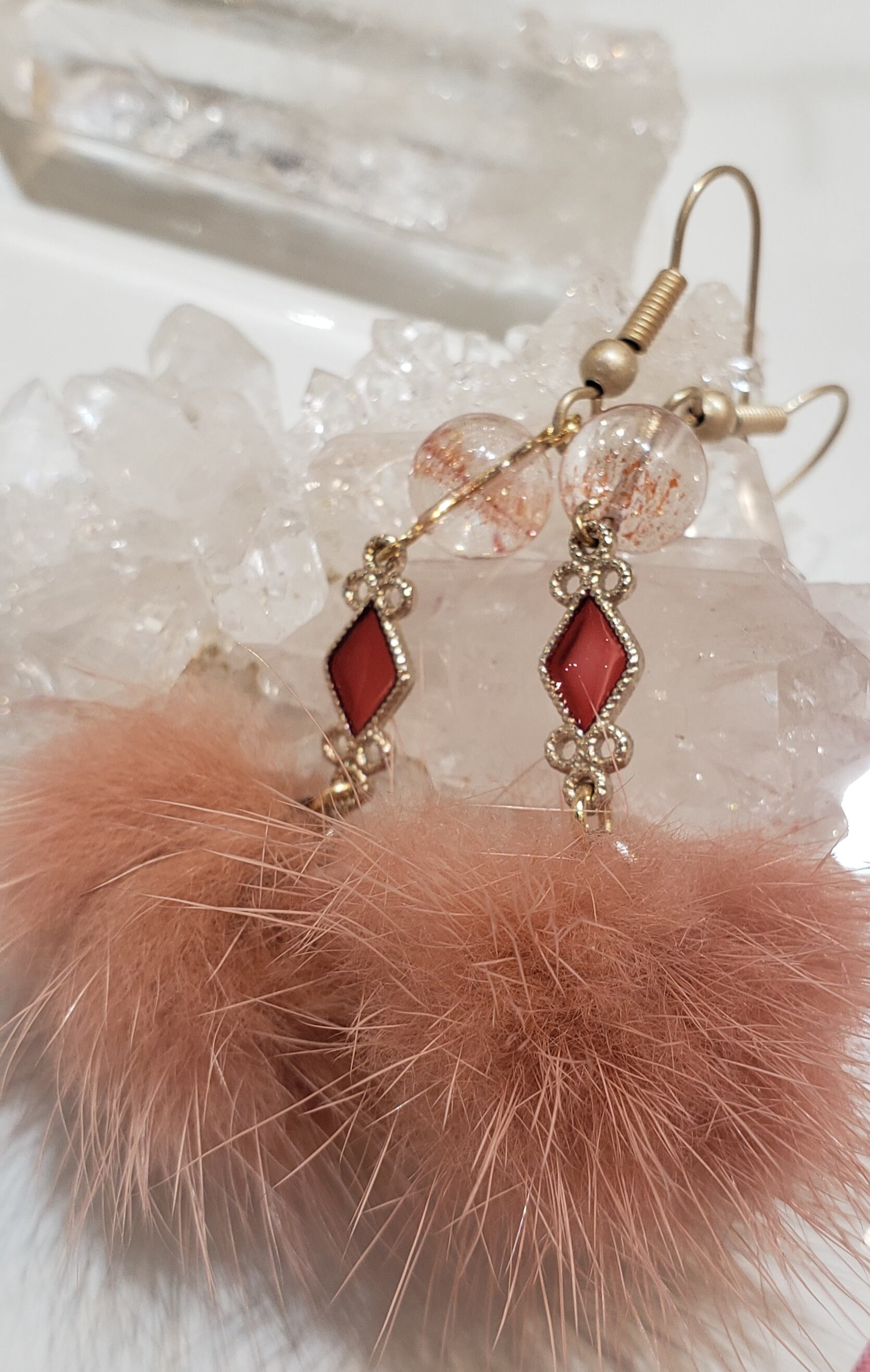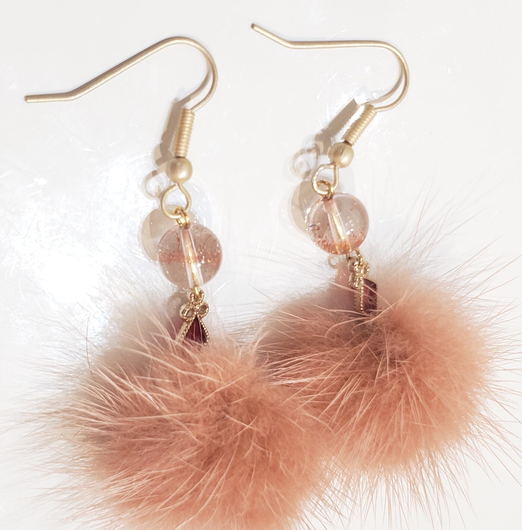耳元で揺れるラビットファーはコーラルピンク。